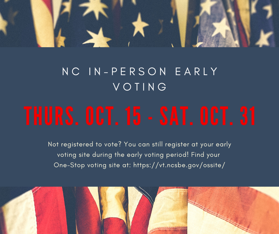 North Carolina's early voting period for the 2020 election is Thursday, October 15 - Saturday, October 31. Not registered to vote? You can still register at your early voting site during the early voting period! Find your One-Stop voting site at: https://vt.ncsbe.gov/ossite/