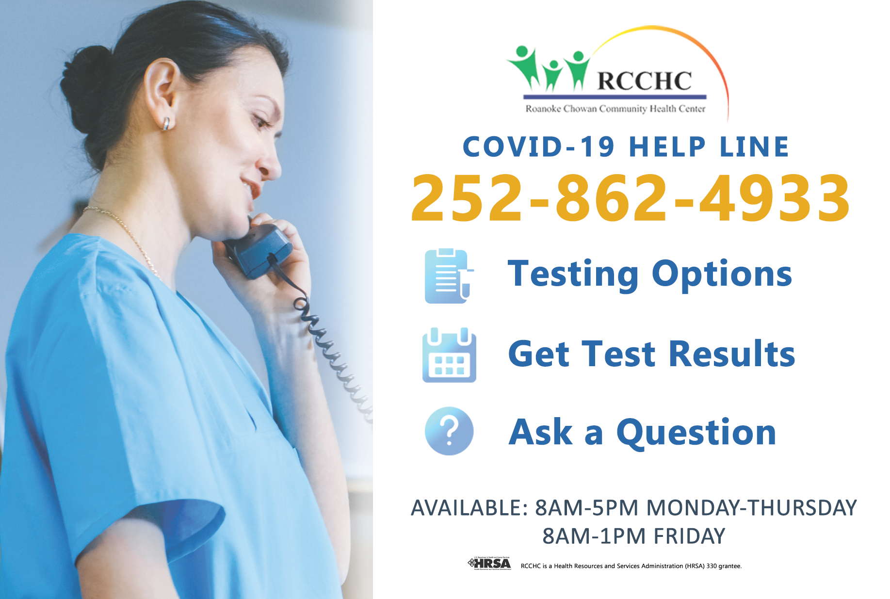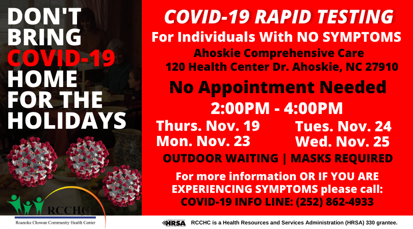RCCHC’s COVID-19 Information Line is now live! Call (252) 862-4933 to learn about testing options, get test results and ask questions. The Information Line is available 8am-5pm Monday-Thursday and 8am-1pm Friday.
