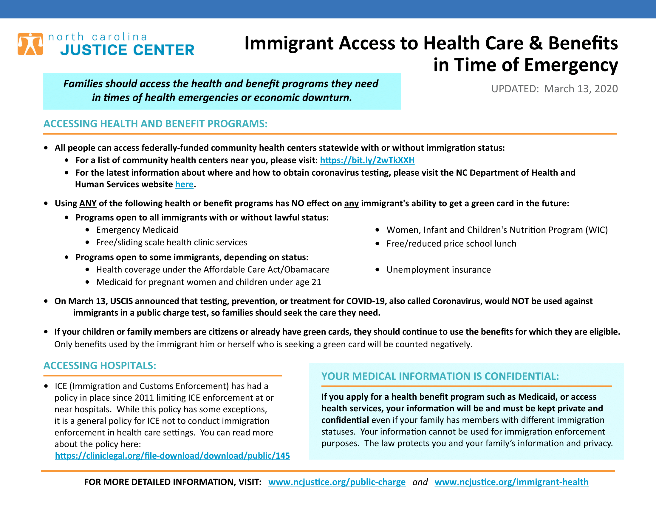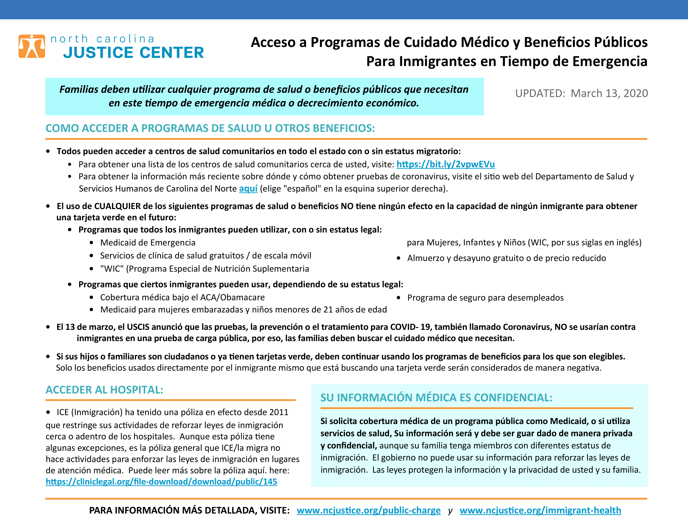 On March 13, USCIS announced that testing, prevention, or treatment for COVID-19, also called Coronavirus, would NOT be used against immigrants in a public charge test, so families should seek the care they need.